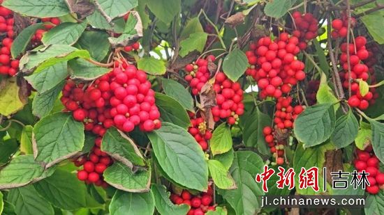 秋日里,安圖縣亮兵鎮(zhèn)會財村色彩斑斕,一株株藤蔓沿著水泥樁蜿蜒攀升,一排排連成一片,遠遠望去,如同為田野織就了一層綠綢;綴滿其間的五味子,則是這綢面上最亮眼的“紅寶石”。