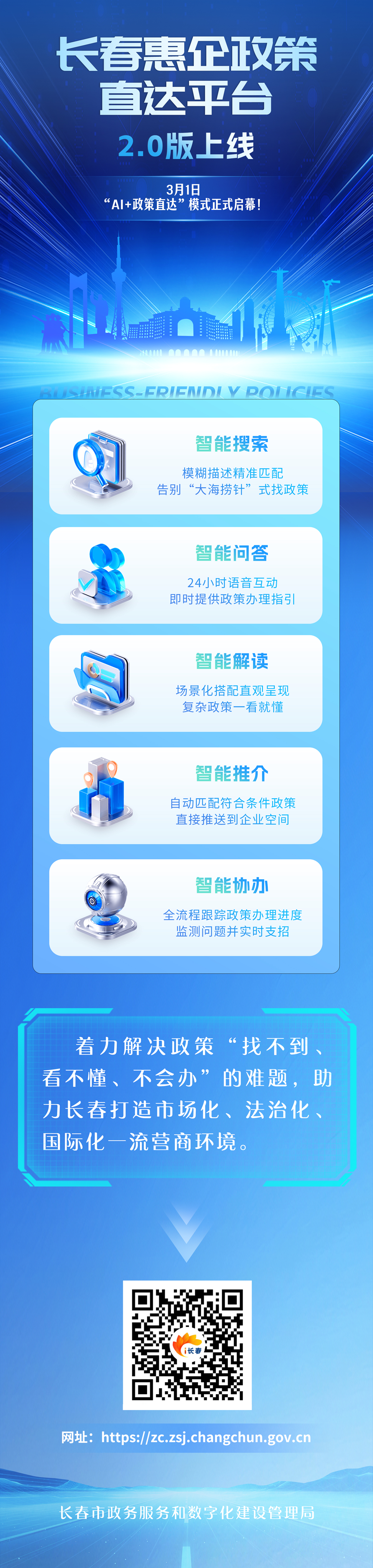中新網吉林新聞3月2日電 3月1日起,長春企業(yè)找政策、辦政策有了“智能管家”。由長春市政務服務和數(shù)字化建設管理局牽頭打造的惠企政策直達平臺2.0版正式上線。新平臺主打“AI+政策”模式,企業(yè)主不用琢磨關鍵詞,像日常聊天一樣和AI說句話,系統(tǒng)就能自動分析、精準匹配可享受的政策。
