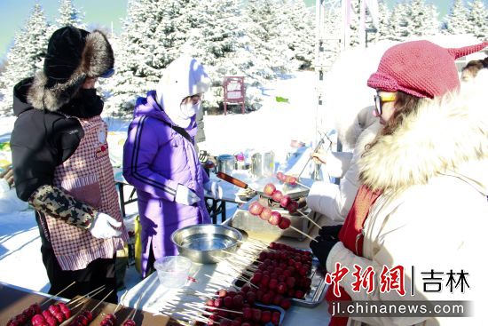啟動儀式后,現(xiàn)場舉行了豐富的互動體驗活動,包括民族歌舞快閃、吉他彈唱等演出,剪紙、鐵藝、糖人等非遺技藝展示,以及雪地拔河、趣味套圈等冰雪游戲。此外,參雞湯、關(guān)東煮等特色美食也為游客帶來了溫暖的味覺體驗。游客們還在粉色雪景網(wǎng)紅拍照點(diǎn)和溫馴麋鹿互動區(qū)駐足打卡,定格浪漫瞬間。