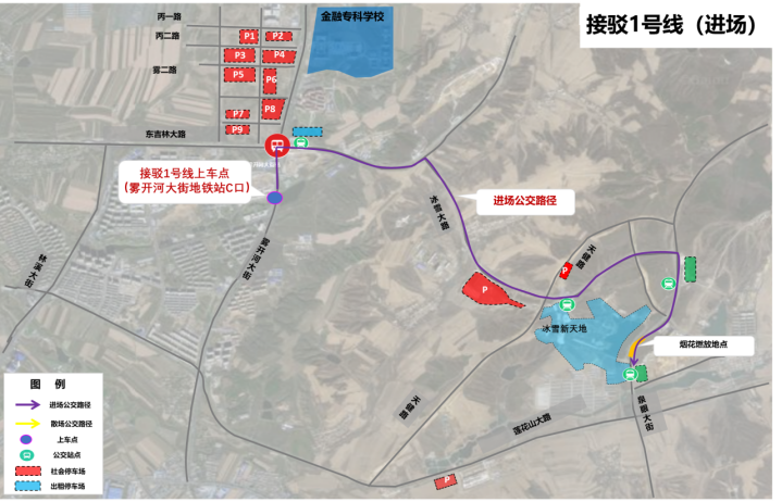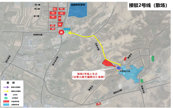 乘坐地鐵2號線在霧開河大街站C口出站,換乘接駁1號線公交車,前往冰雪新天地1、2號門。(如下圖)