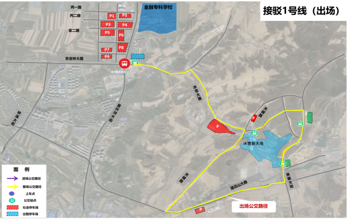 游客可在冰雪新天地1號門(冰雪大路路南)、天定山滑雪場(泉眼大街路西)、冰雪新天地2號門(泉眼大街路西)乘坐接駁1號線公交車返回地鐵霧開河大街站B口,轉乘地鐵等交通方式離開蓮花山。(如下圖)