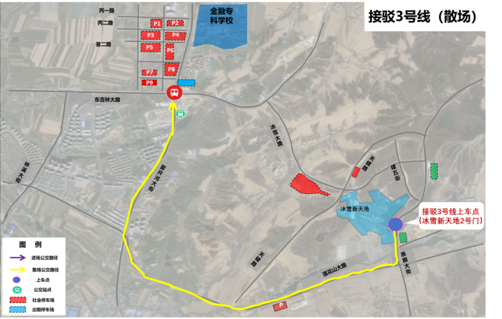 2號門:從冰雪新天地2號門出園游客,乘坐接駁3號線公交車返回地鐵霧開河大街站C口,換乘地鐵等交通方式離開蓮花山。(如下圖)