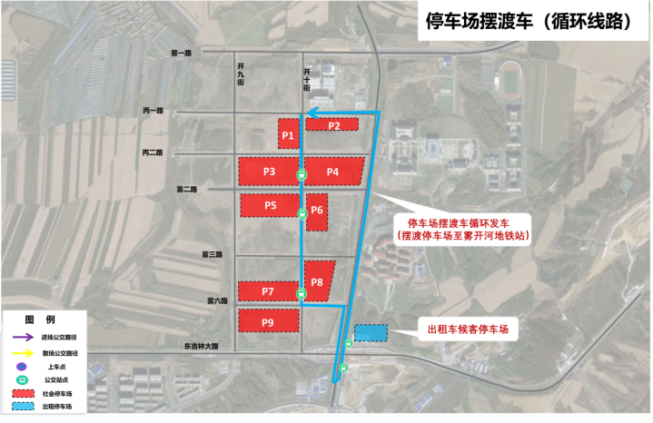 2號門:乘坐接駁3號線公交車,返回地鐵霧開河大街站C口;換乘停車場擺渡車,返回臨時停車場。(如下二圖)