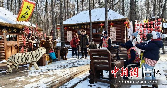 愛心玫瑰與雪人谷成為打卡熱點,百余個創(chuàng)意雪人錯落分布,雪雕玫瑰形態(tài)各異,游客爭相合影。關(guān)東文化園威虎山土匪寨角色扮演區(qū)人氣爆棚,游客換上土匪服飾,手持道具槍模擬“打土匪”互動,笑聲與吶喊聲中重現(xiàn)歷史場景。“這比單純滑雪更有意思!”游客王先生興奮地表示,“土匪寨體驗讓我仿佛穿越回關(guān)東時代,文化元素讓冰雪活動更鮮活!