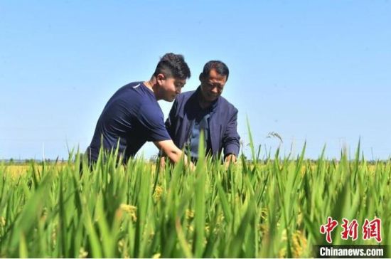 金秋時節(jié),臺胞林駿睿(左)與吉林農(nóng)民楊萬芳在稻田里觀察水稻。 高龍安 攝