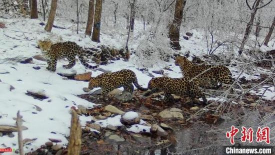 四只東北豹在林區(qū)散步。(資料圖)東北虎豹國家公園管理局供圖
