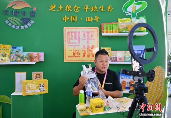 8月15日,吉林長(zhǎng)春,商家在農(nóng)博園內(nèi)直播售買(mǎi)玉米。當(dāng)天,第二十四屆中國(guó)長(zhǎng)春國(guó)際農(nóng)業(yè)·食品博覽(交易)會(huì)在長(zhǎng)春開(kāi)幕。本屆農(nóng)博會(huì)集中展示中國(guó)最前沿的農(nóng)業(yè)科技成果,彰顯“大國(guó)糧倉(cāng)”的科技實(shí)力,吸引眾多參觀者近距離體驗(yàn)現(xiàn)代種植技術(shù)及優(yōu)質(zhì)農(nóng)產(chǎn)品。中新社記者 張瑤 攝
