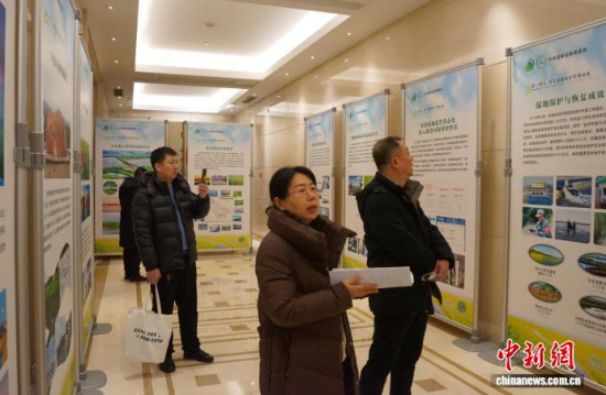 2月2日,參會人員在參觀吉林省濕地保護宣傳板。 單碩 攝