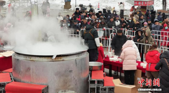 中新網(wǎng)吉林2月5日電 (記者 石洪宇)在廣場上架起直徑2米的大鐵鍋,柴火在灶里噼啪作響。廚師揭開鍋蓋,熱氣蒸騰,年豬燴菜的濃香四散飄溢。