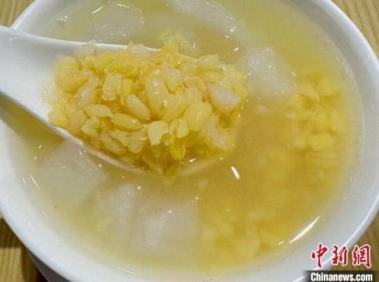 “世界糖水在中國,中國糖水在廣東!睂(duì)廣州人而言,在炎熱的夏日或寒冷的冬夜,與好友相約糖水鋪,“食”上一碗滋補(bǔ)的糖水,甜蜜就能讓整個(gè)人“充滿電”。圖為馬蹄綠豆爽。 中新社記者 王堅(jiān) 攝