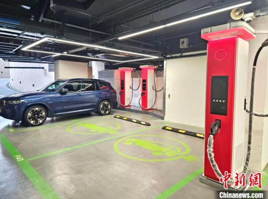 圖為華為在香港將軍澳藍(lán)塘匯商場(chǎng)停車(chē)場(chǎng)內(nèi)設(shè)置的充電站!∠愀廴A為國(guó)際有限公司供圖