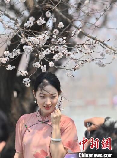 4月21日,一名年輕女孩在杏花樹下拍照。張瑤 攝