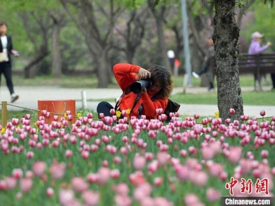 小朋友在盛開的郁金香旁玩耍。公園內(nèi)的郁金香迎來盛花期。民眾在盛開的郁金香旁打卡拍照。攝影愛好者正在拍攝盛開的郁金香。盛開的郁金香吸引大量民眾前來賞花。
