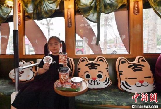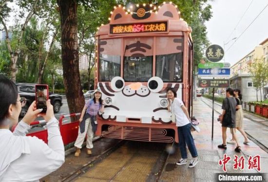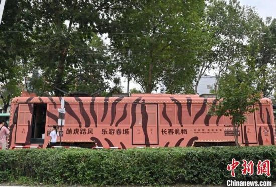 8月5日,吉林長春,游客在54路文旅東北虎專列內(nèi)拍照。該專列是以“東北虎”為主題的有軌電車文旅專列,步入其中、綠意盈盈“森系”十足,吸引眾多游客前來打卡。(中新社記者 張瑤/攝)