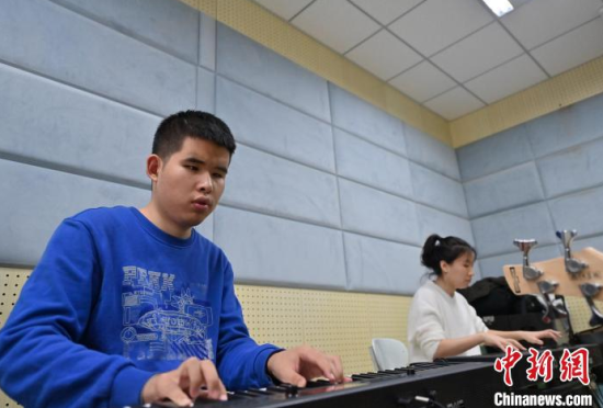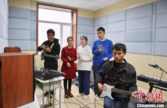 11月14日,吉林長春,“逐暗逐光”樂隊成員在交流排練細節(jié)。長春大學特教學院有一支名叫“逐暗逐光”的樂隊,樂隊成員都是視障學生。他們因音樂相聚在一起,用音樂去驅逐黑暗追逐光明。中新社記者 張瑤 攝