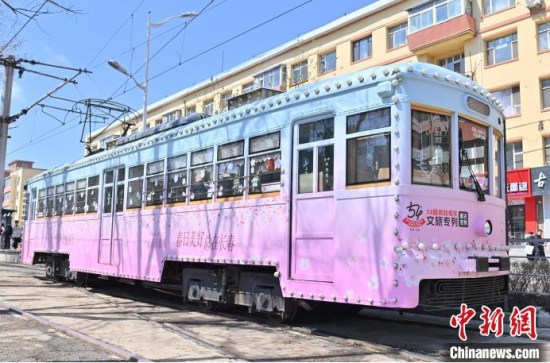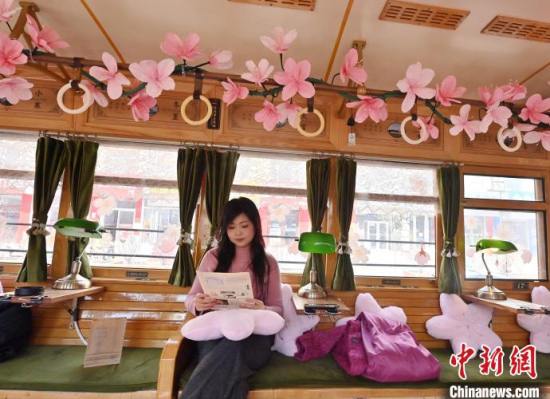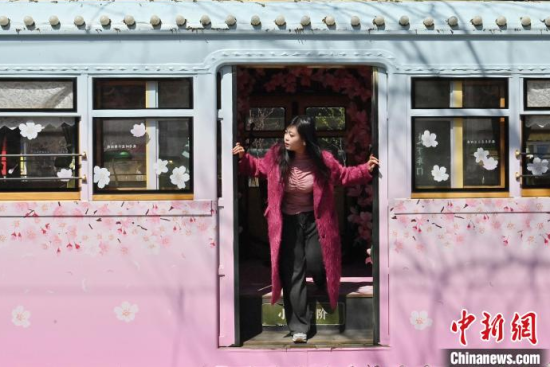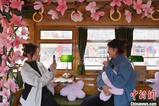 4月18日,吉林長春,游客在54路文旅春日限定專列上拍照留念。該專列車廂內(nèi)外融入了桃花的設(shè)計(jì)元素,營造出濃郁的春意,吸引了眾多游客前來打卡。中新社記者 張瑤 攝