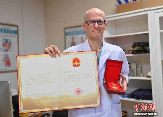 10月17日,吉林長(zhǎng)春,意大利醫(yī)生拉瓦若展示患者送他的錦旗。十年前,他作為國際志愿者與長(zhǎng)春結(jié)緣,被當(dāng)?shù)貙iT救助貧困心臟病患者的“吉心工程”所打動(dòng),決定留下。近日,他榮獲中國政府友誼獎(jiǎng)。他表示將繼續(xù)留在長(zhǎng)春,培育青年醫(yī)生、優(yōu)化診療體系,讓更多患者擁有“心跳的力量”。中新社記者 張瑤 攝