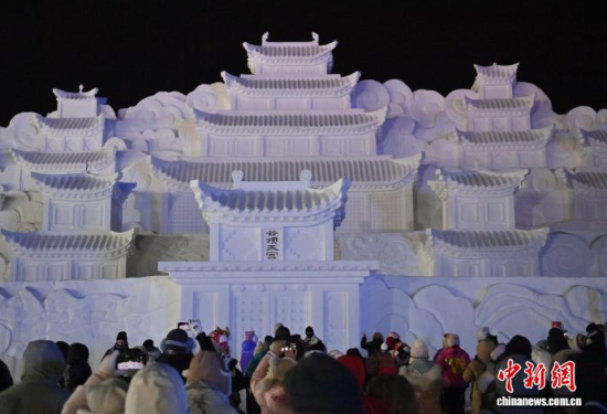 12月26日晚,吉林長白山,新落成的高30米、寬70米、用雪量10萬立方米的雪雕版“云頂天宮”正式點(diǎn)亮。這座以探險(xiǎn)題材小說《盜墓筆記》為藍(lán)本雕琢的冰雪地標(biāo)廣受書迷關(guān)注。中新社記者 張瑤 攝