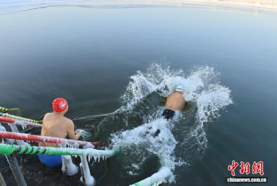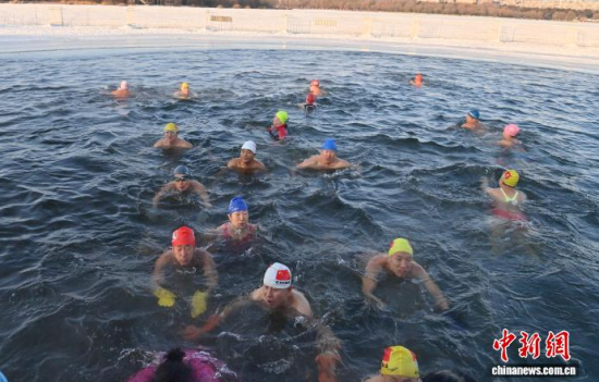 2026年1月1日,在長春南湖公園,冬泳愛好者在湖水中暢游。當(dāng)天,近百名冬泳愛好者齊聚南湖,以冬泳的方式迎接新年。中新社記者 張瑤 攝