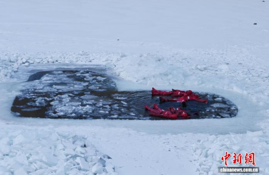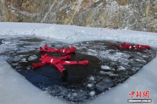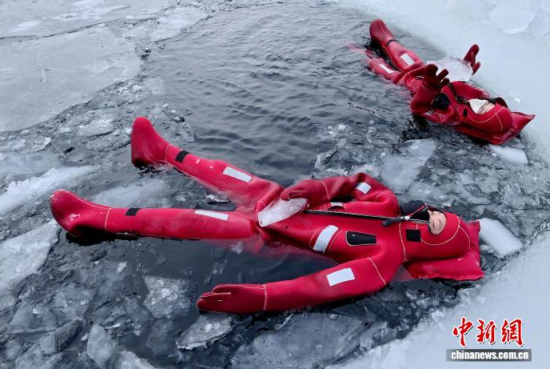 2月5日,吉林省長(zhǎng)春市,一項(xiàng)獨(dú)特的冰浮項(xiàng)目吸引眾多游客前來體驗(yàn)。在嚴(yán)寒天氣中,參與者身穿醒目的紅色浮力裝備,悠然漂浮于冰面之上,感受別致的冰雪樂趣。圖為游客在下水前拍照留念。中新社記者 張瑤 攝
