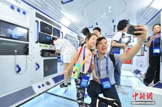 營員們在天和核心艙模型參觀拍照。