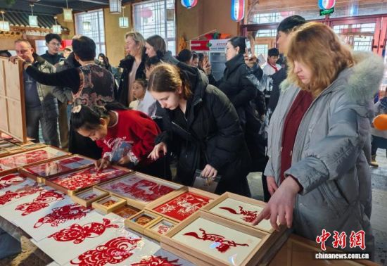 3月8日,吉林安圖,俄羅斯游客觀(guān)看剪紙作品。趙健慧 攝